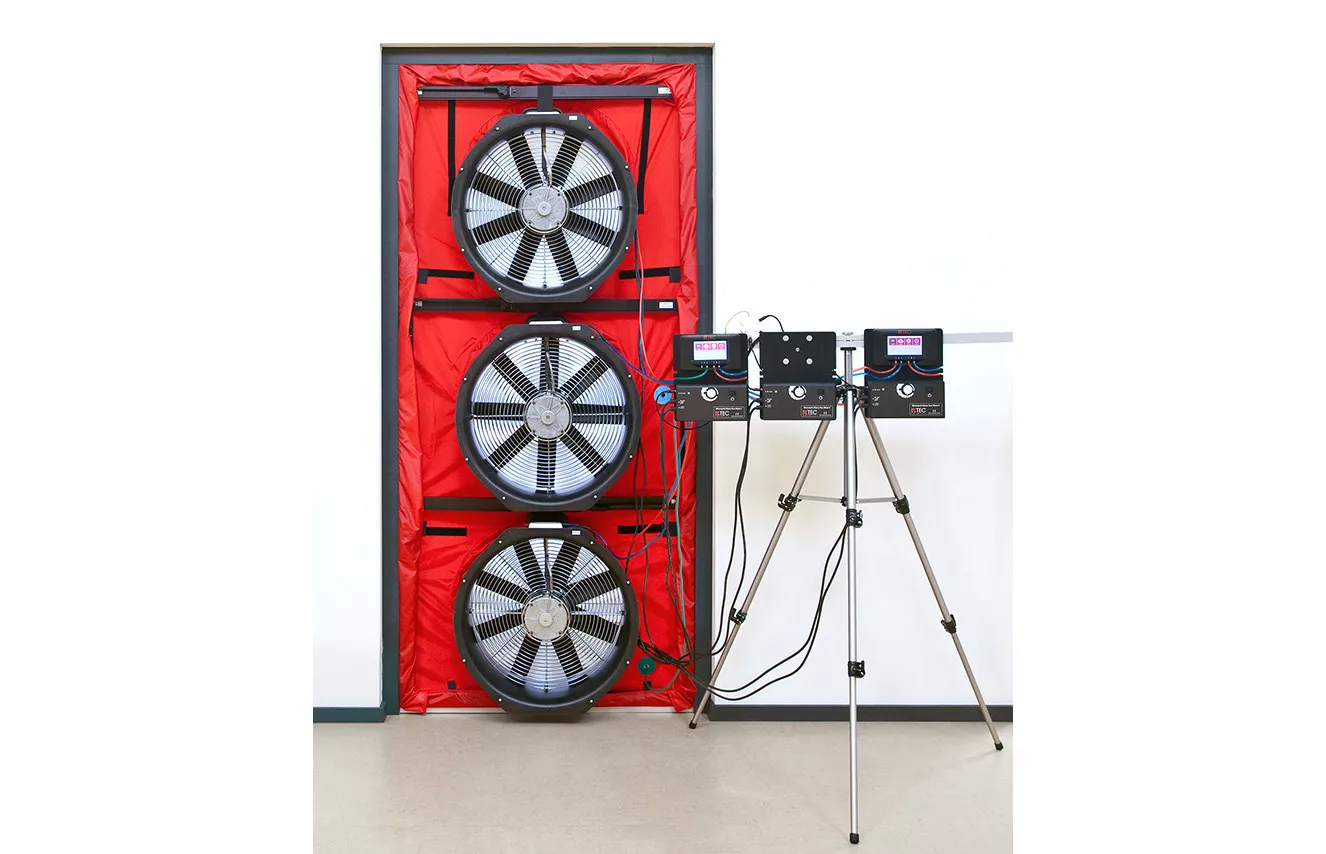 Le système de mesure BlowerDoor MultipleFan avec 3 ventilateurs BlowerDoor et 2 manomètres DG-1000 a été développé pour la mesure de l'étanchéité à l'air de bâtiments avec une surface d'enveloppe d'environ 10.000 m² ou un volume de bâtiment allant jusqu'à 40.000 m³. Outre la mesure de grands bâtiments, il permet également une utilisation dans les maisons individuelles et les immeubles collectifs avec une ou deux ventilateurs BlowerDoor. Grâce à l'étalonnage séparé du manomètre et du ventilateur, la précision exceptionnelle de la technique de mesure BlowerDoor est maintenue même en cas de combinaison de différents composants du système, comme par exemple le DG-700 et le DG-1000.