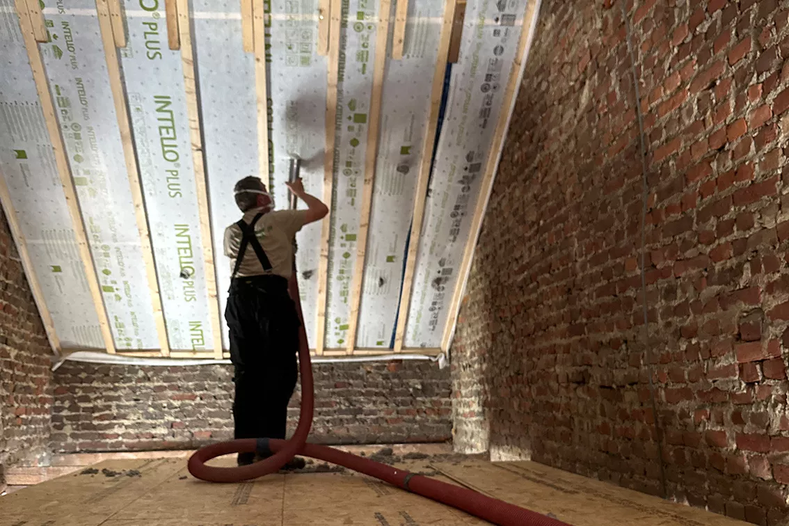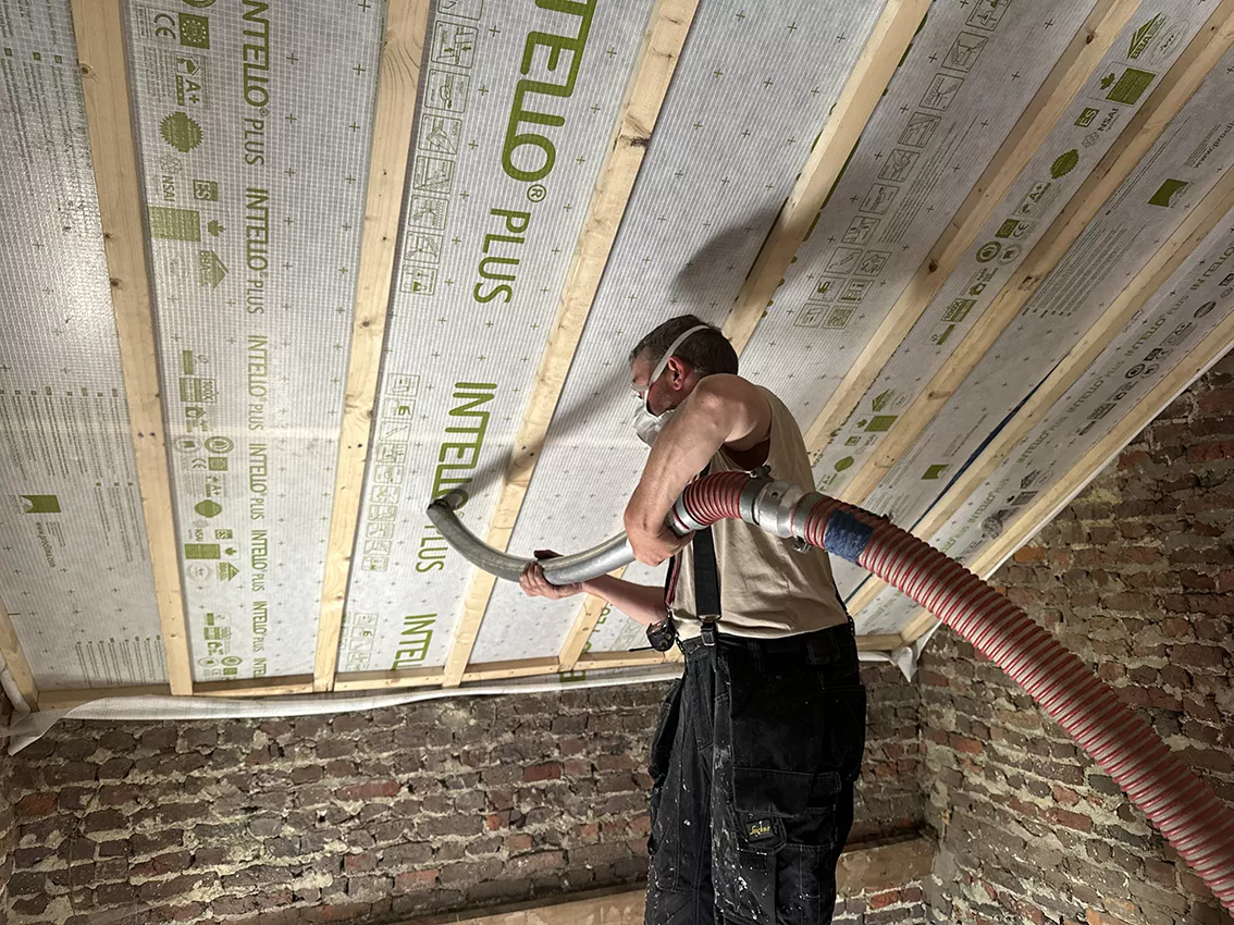 'Op onze werf werd er ongeveer 80m³ cellulose ingeblazen op amper 3 dagen tijd. Door deze snelle verwerking is de cellulose ook meteen – zonder alle ecologische argumenten – ook een prijsbewuste keuze.'
