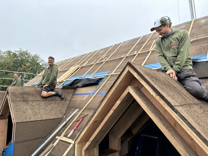 Bij het isoleren van het dak kozen Katrien en haar bouwpartners ervoor om de bouwschil te plaatsen volgens het ISOPROC systeem. Dit systeem bestaat uit iQ3 cellulose isolatie, aangevuld met Celit houtvezelplaten voor onderdaken en pro clima luchtdichtingmateriaal